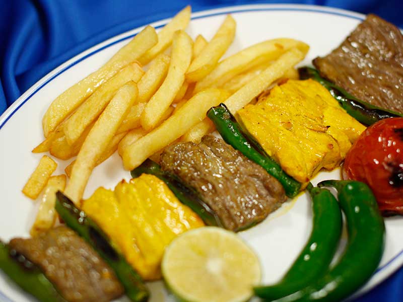 veal filled piece- chicken- onion- capcicum Grill Skewers With Frenchfries and Salad- Cucumber Yoghurt Sauce And Bread. With your choice of Rice or French Fries