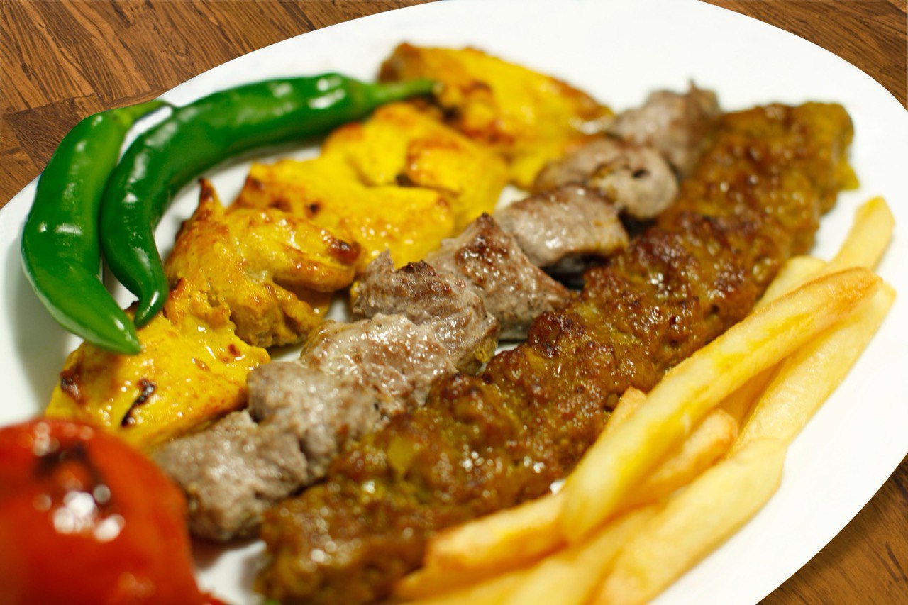 3 Grill Skewers With Salad- Cucumber Yoghurt Sauce And Bread. With your choice of Rice or French Fries