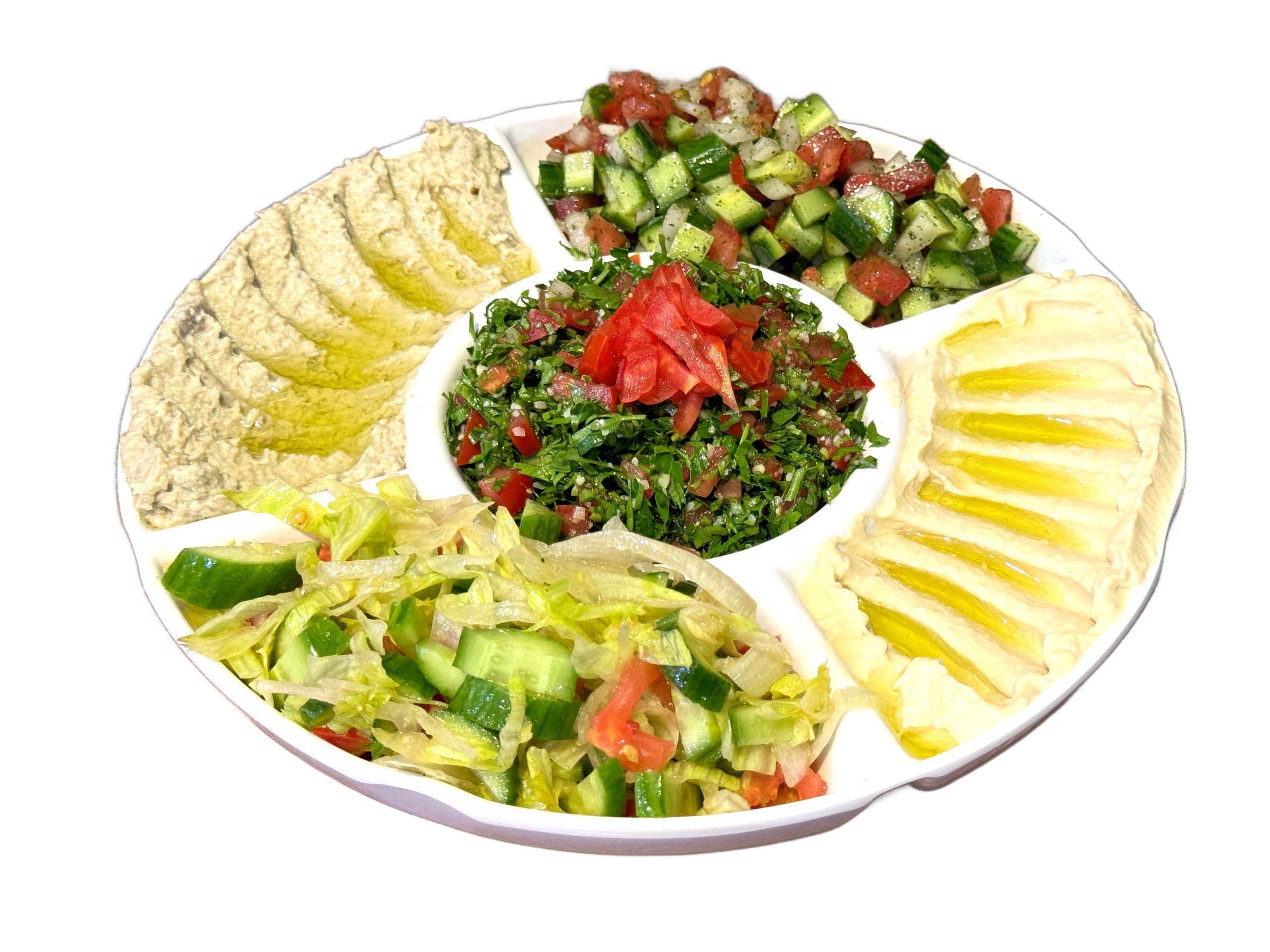 Mixed greens- cherry tomatoes- cucumbers- red onions- carrots- bell peppers- and a vinaigrette dressing.